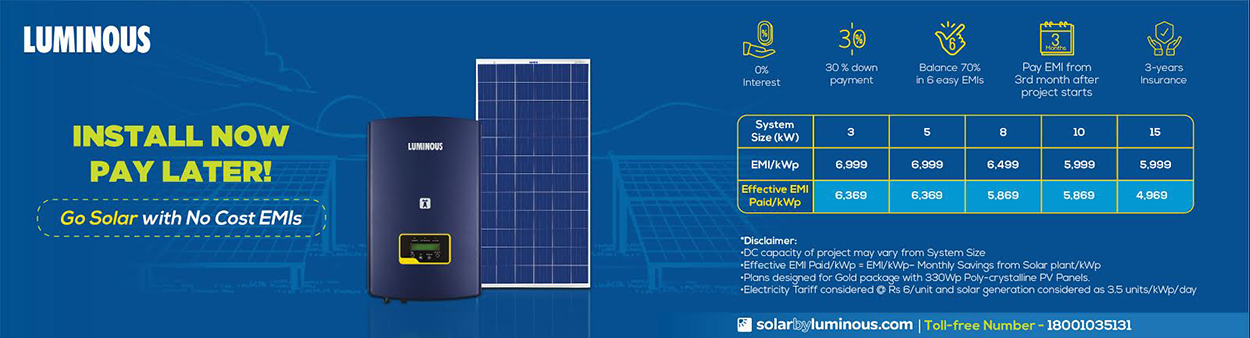 Luminous understands the importance and need of switching to solar energy, which is why we offer several solar finance and solar loan options to our customers. We want your journey towards solar to be a great one and one that isn’t too heavy on your pocket. So, if budget constraints are stopping you from shifting to clean and renewable energy, you need not worry anymore as Luminous’ is here to help!