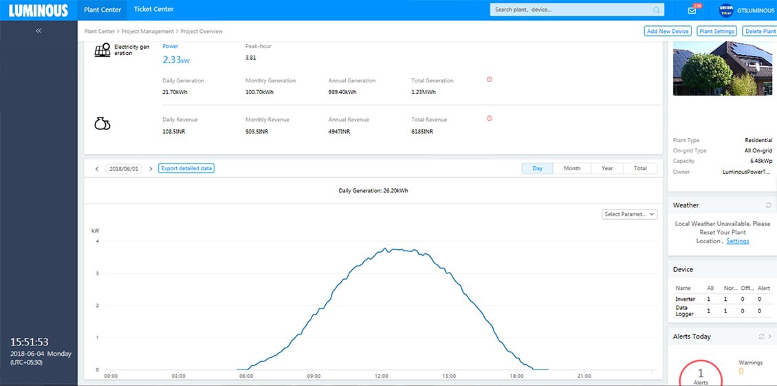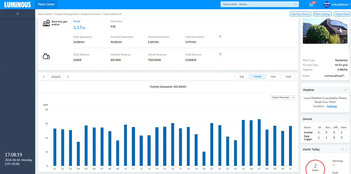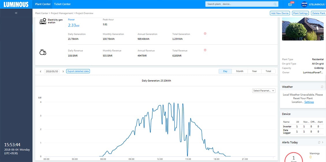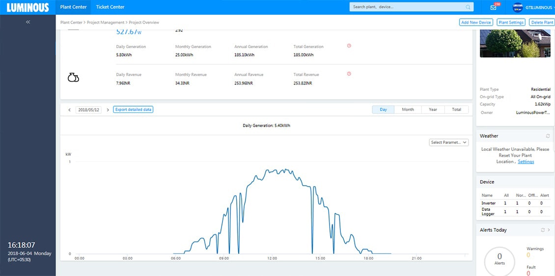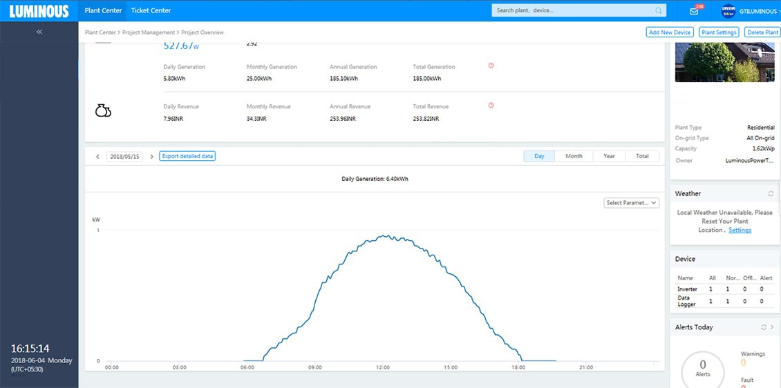 We design solar solutions using latest solar software and simulators to conduct shadow and Irradiation analysis. In the execution stage, multiple audits are performed to ensure right quality of both – the products and installation. Accurate solar design combined with superior execution ensures best-in-class performance of Luminous solar solutions. The following screenshots show the generation trends of some of our solar plants .