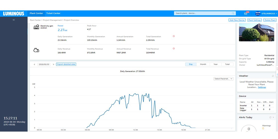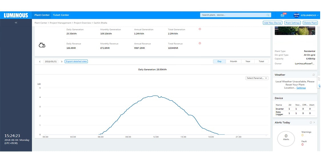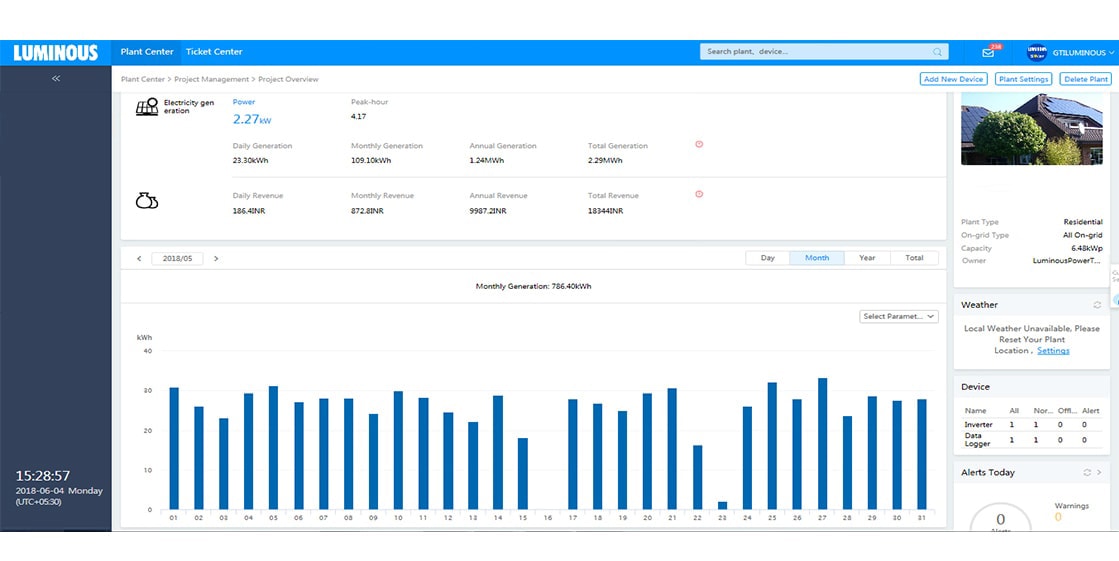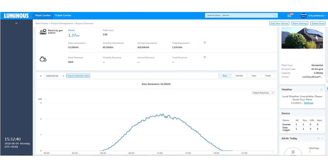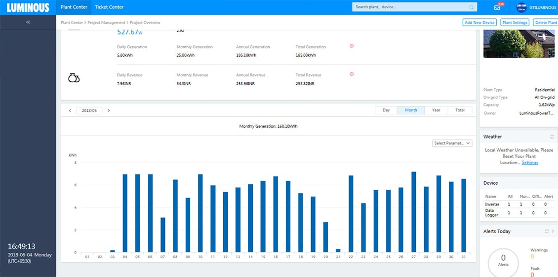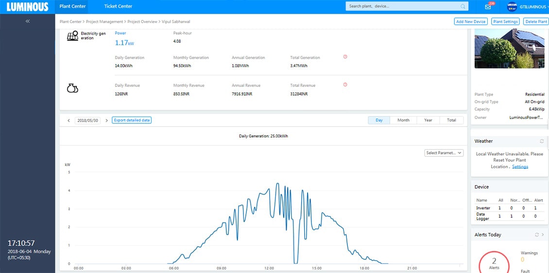 We design solar solutions using latest solar software and simulators to conduct shadow and Irradiation analysis. In the execution stage, multiple audits are performed to ensure right quality of both – the products and installation. Accurate solar design combined with superior execution ensures best-in-class performance of Luminous solar solutions. The following screenshots show the generation trends of some of our solar plants .